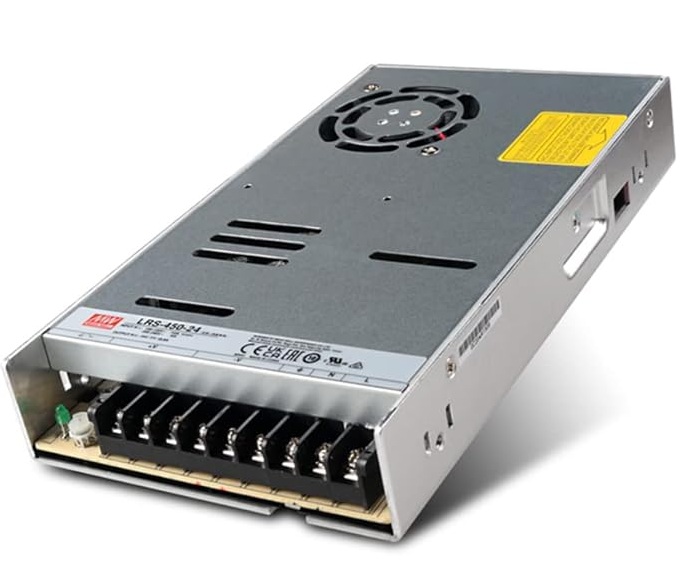 A Mean Well LRS-450-24 egy nagy megbízhatóságú, ipari kategóriás kapcsolóüzemű tápegység, amely stabil 24 voltos kimeneti feszültséget biztosít akár 18,8 amper áramerősség mellett.