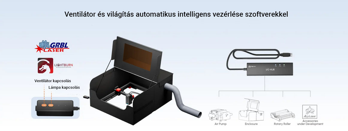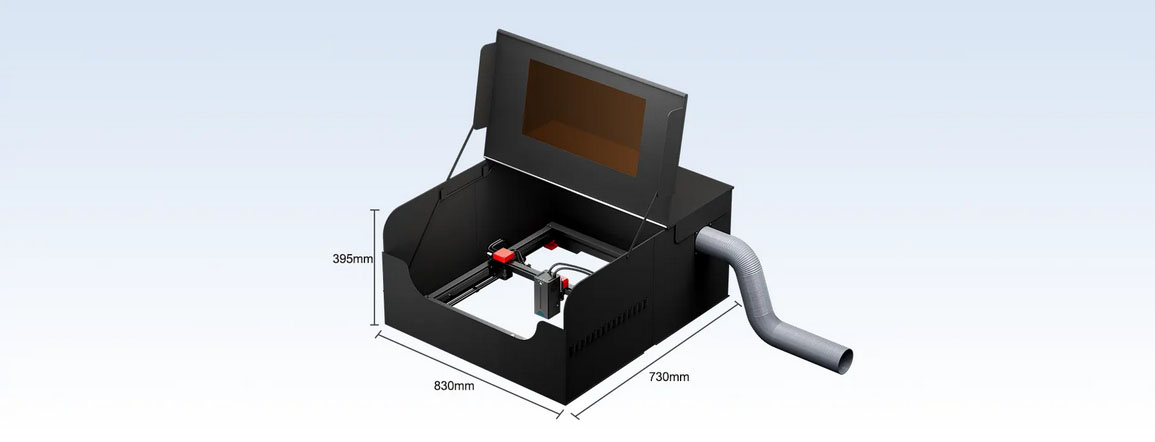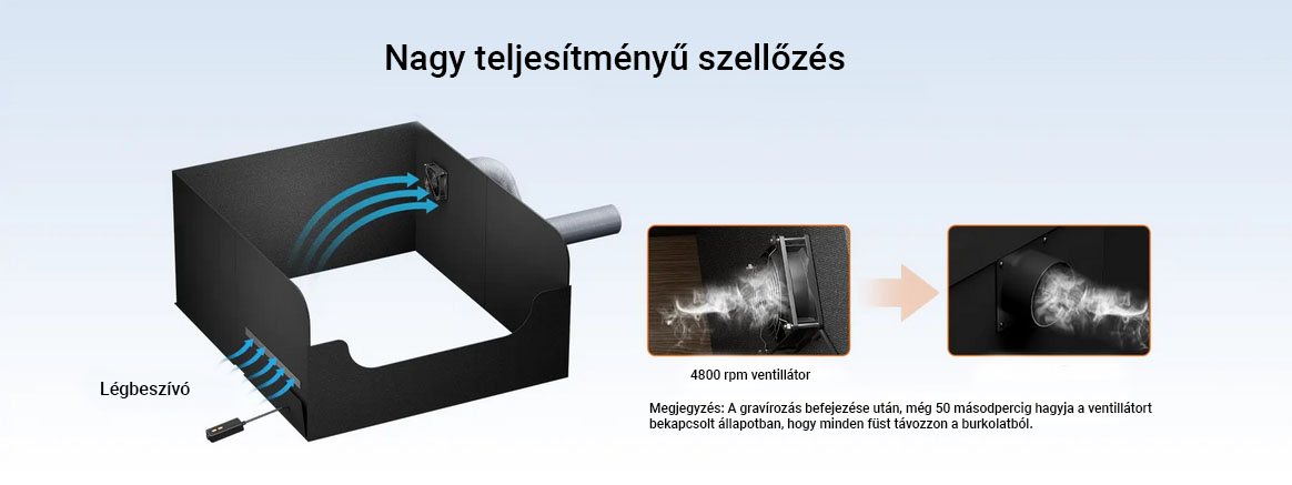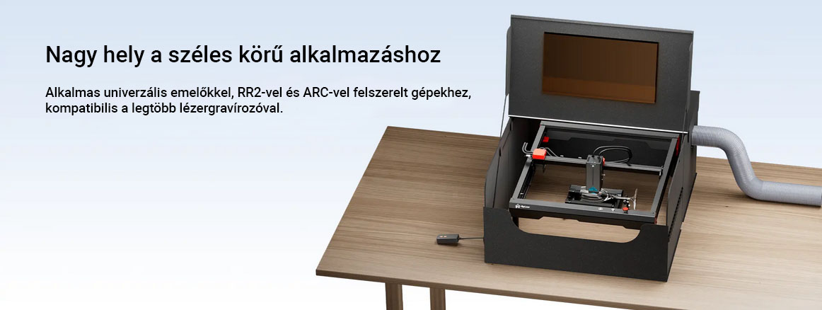Stabil, zárt munkateret ad a lézergravírozáshoz: segít egy helyre terelni a füstöt és a port, miközben a narancs betekintő ablakon át kényelmesen ellenőrizheted a munkát. A ház beépített világítással, ventilátorral és füstelvezető cső csatlakozással érkezik, így könnyebben megoldható a füst kivezetése.