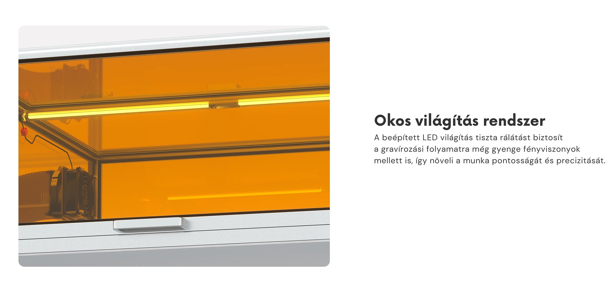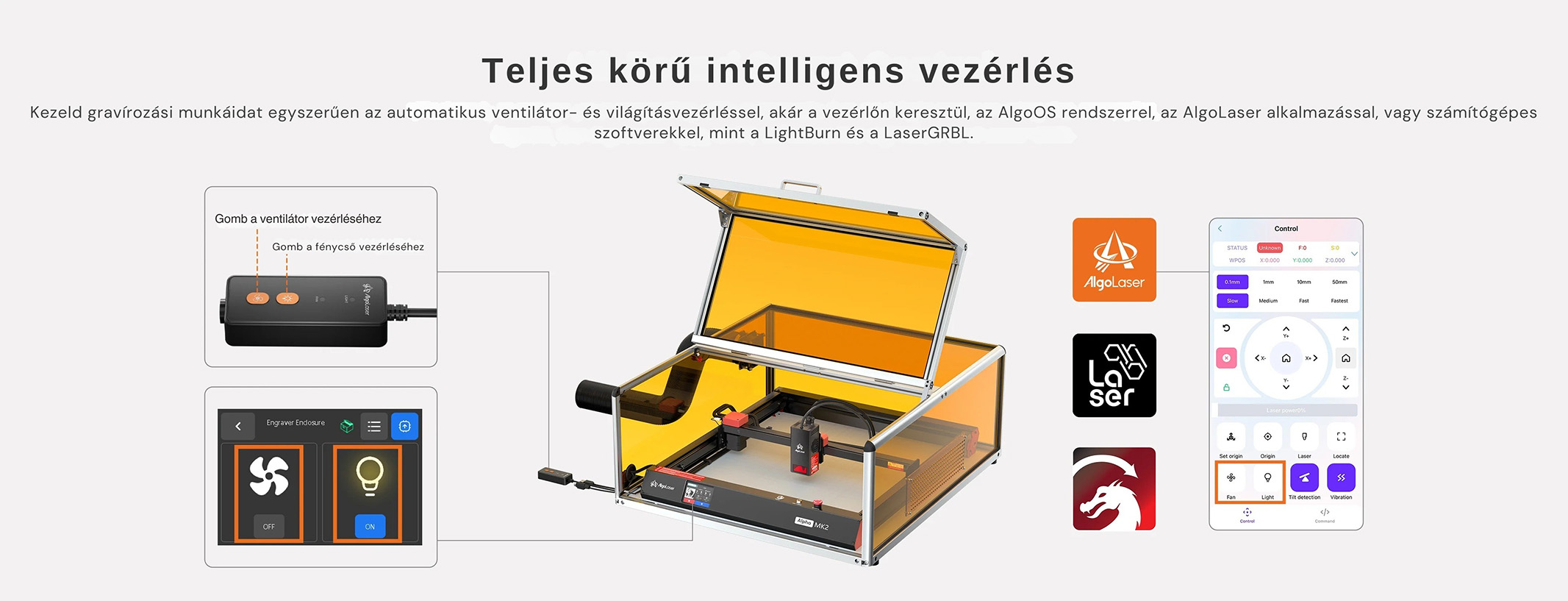 Az AlgoLaser Smart Enclosure 2.0 egy prémium, merev falú lézergravírozó-ház beépített HD kamerával, amely teljes munkatér nézetet ad és segít a precíz pozicionálásban. A fedélnyitás-érzékelős biztonsági leállítás, a 4800 rpm elszívóventilátor, a LED világítás és az okos vezérlés tisztább, kényelmesebb és kontrolláltabb gravírozást tesz lehetővé.