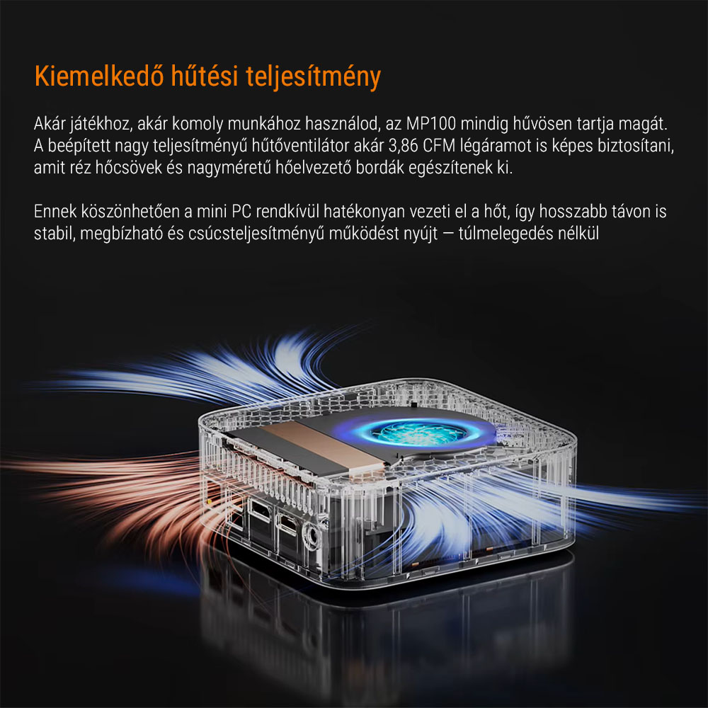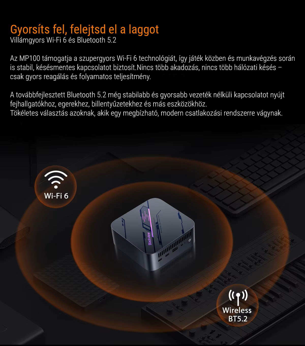A Blackview MP100 egy ultrakompakt, mégis kimagasló teljesítményű mini PC, amely tökéletes választás munkához, otthoni használatra vagy akár játékhoz is. A mindössze tenyérnyi méretű készülékben AMD Ryzen™ 7 processzor dolgozik, villámgyors SSD-vel és modern csatlakozókkal. A Windows 11 Home előtelepítve érkezik, így bekapcsolás után azonnal használatra kész.