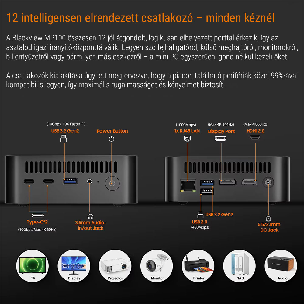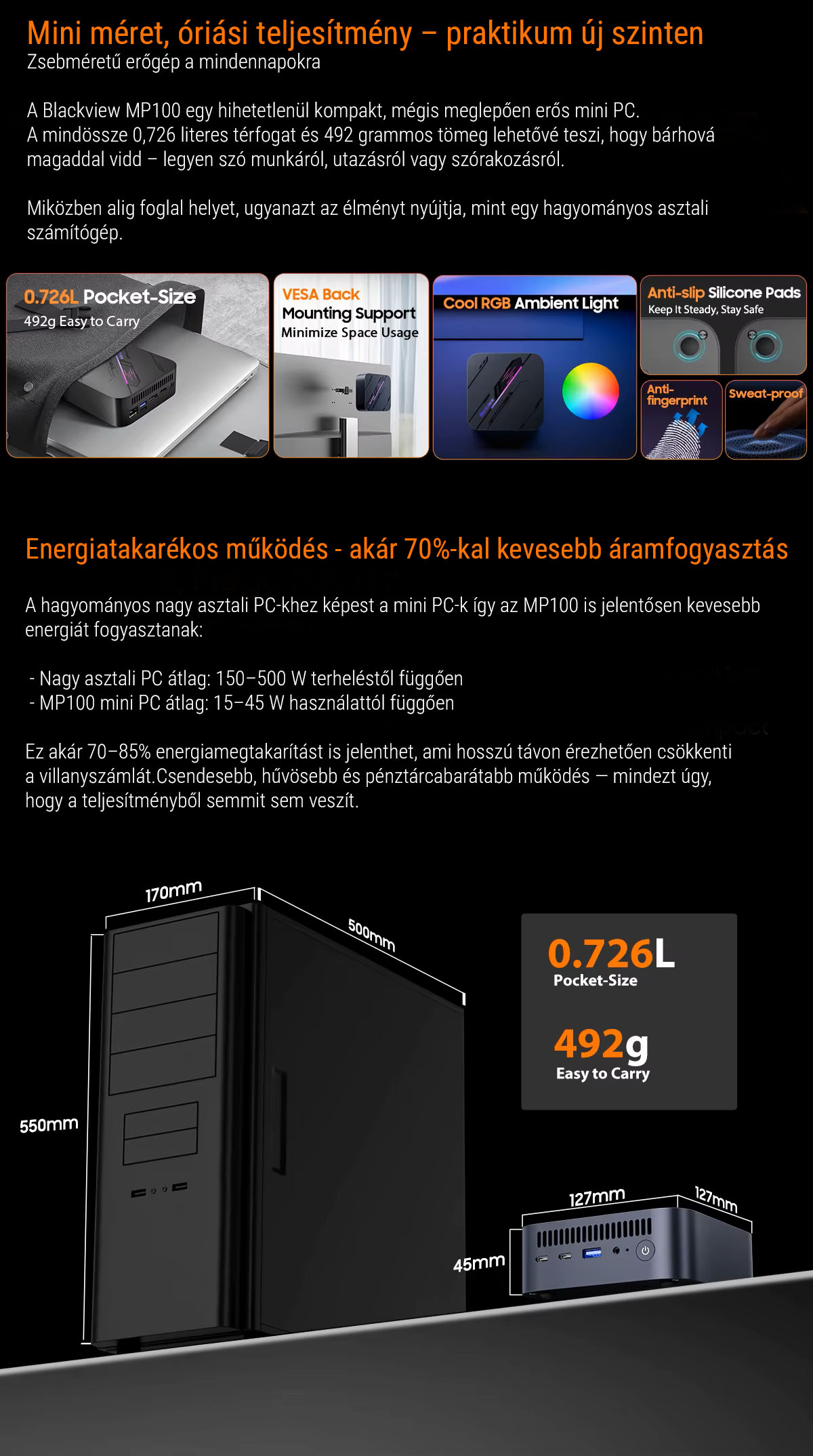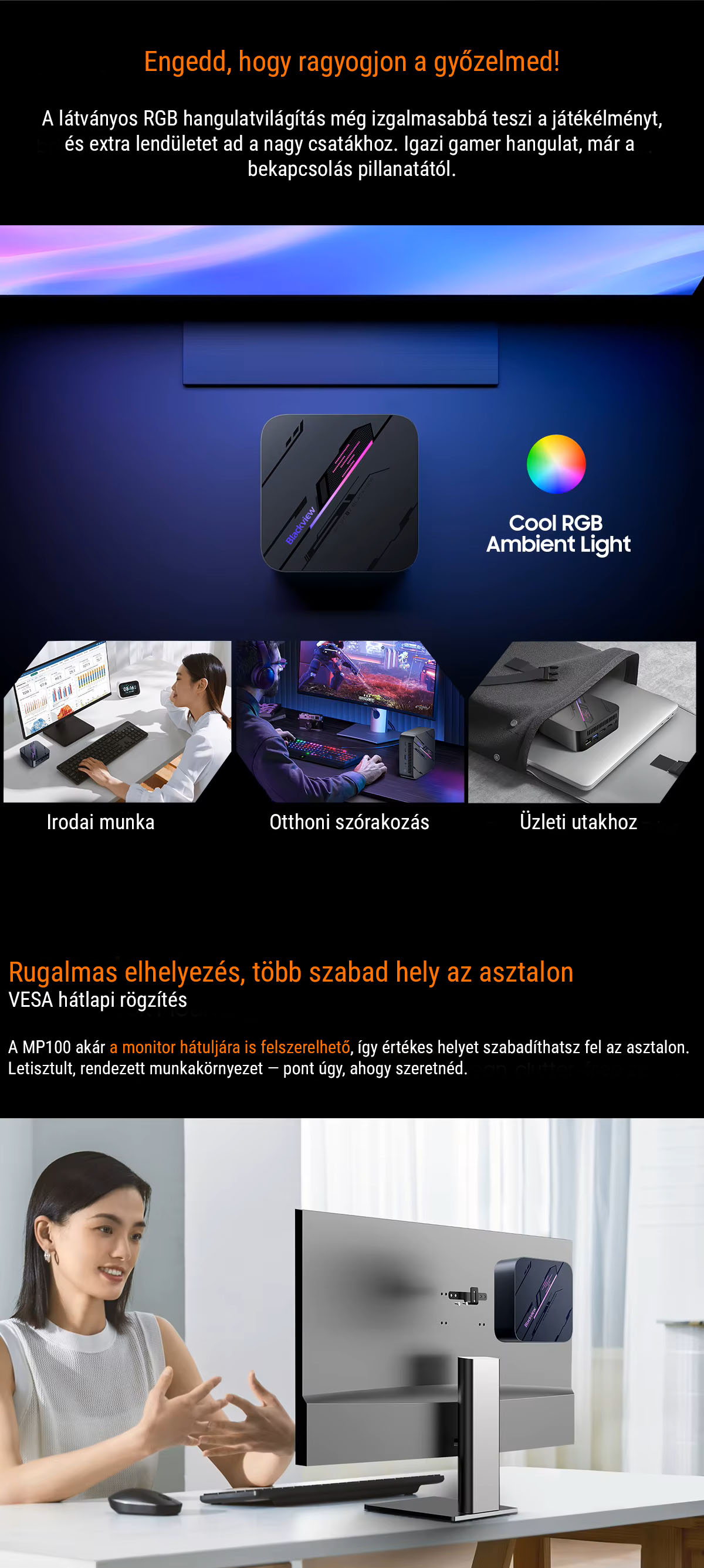 - Méret: mindössze 127 × 127 × 45 mm, VESA rögzítéssel monitor mögé is felszerelhető